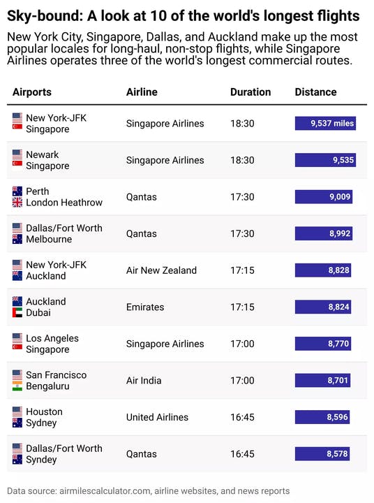 It's also noteworthy that all routes on this list involve Southeast Asia or Australasia and span a distance of 8,500 or more miles. Long flights to other regions include those between Atlanta and Johannesburg, South Africa (8,439 miles; run by Delta Airlines) and Los Angeles and Dubai, United Arab Emirates (8,339 miles; run by Emirates).