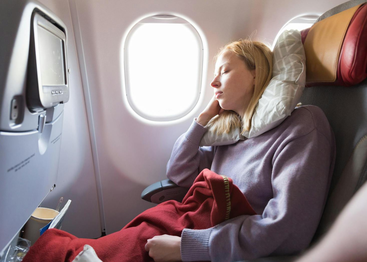 Airplanes are enclosed environments with filtered air systems that can be very dry. Some people can start to feel dryness in their skin and even their eyes a few hours into the flight, so adding moisture to your system is essential. Bring a reusable water bottle and ask flight attendants to fill it with water rather than leaving an open (and tiny) cup on your tray that could easily spill. Don't forget to pack small toiletries like lip balm and lotion to ward off the dry air, which can lead to uncomfortable chapped lips or general itchiness.