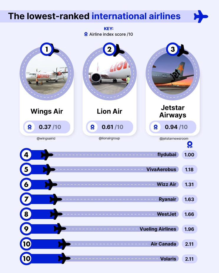 Wings Air has the lowest index score in 2023, at just 0.37 out of 10. The airline had the lowest on-time arrival rate at 47.69%, and the second-highest cancellation rate at 15.91%. This means that flying with Wing Air is risky if you’re on a tight schedule or have connections you need to make.