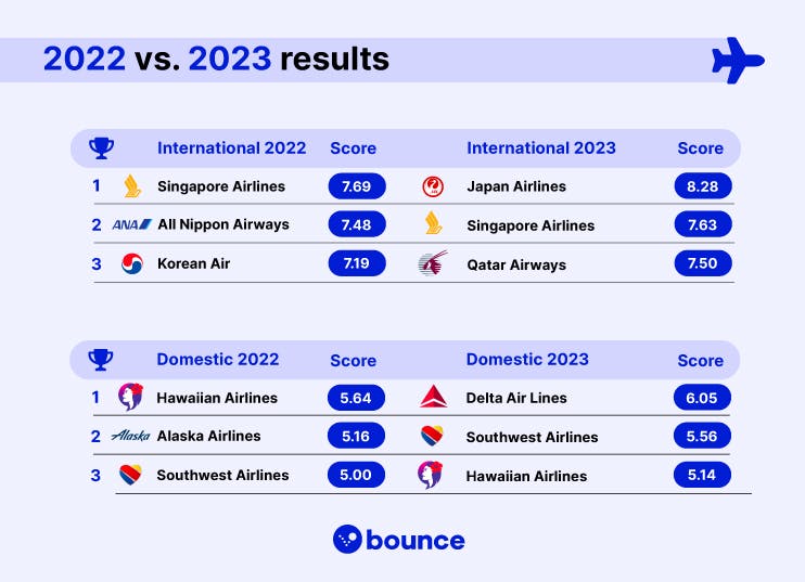 We wanted to recreate our annual Airline Index for 2023 with the latest and most up-to-date data. 52 airlines were included in our international comparison, including the top 50 airlines by number of flights and two airlines that made the top three in our 2022 edition, while the domestic airline section includes 10 of the largest airlines in the United States. Chinese Airlines were excluded from the international section due to COVID travel restrictions only lifted in early 2023, which would have unfairly impacted the results.