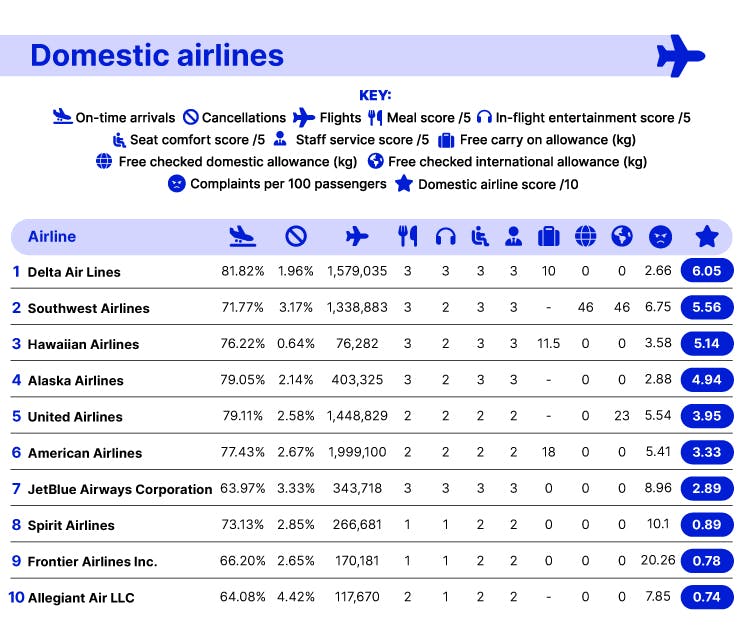 Frontier Airlines received the second-lowest overall score of all US domestic airlines, with just 0.78 out of 10. Frontier’s worst-performing area was complaints, with the airline receiving the highest figure of 20.26 complaints per 100 passengers. There is no luggage allowance included on Frontier flights for either carry-on or checked baggage, and the airline also scored just 1 out of 5 for its in-flight meals and entertainment.