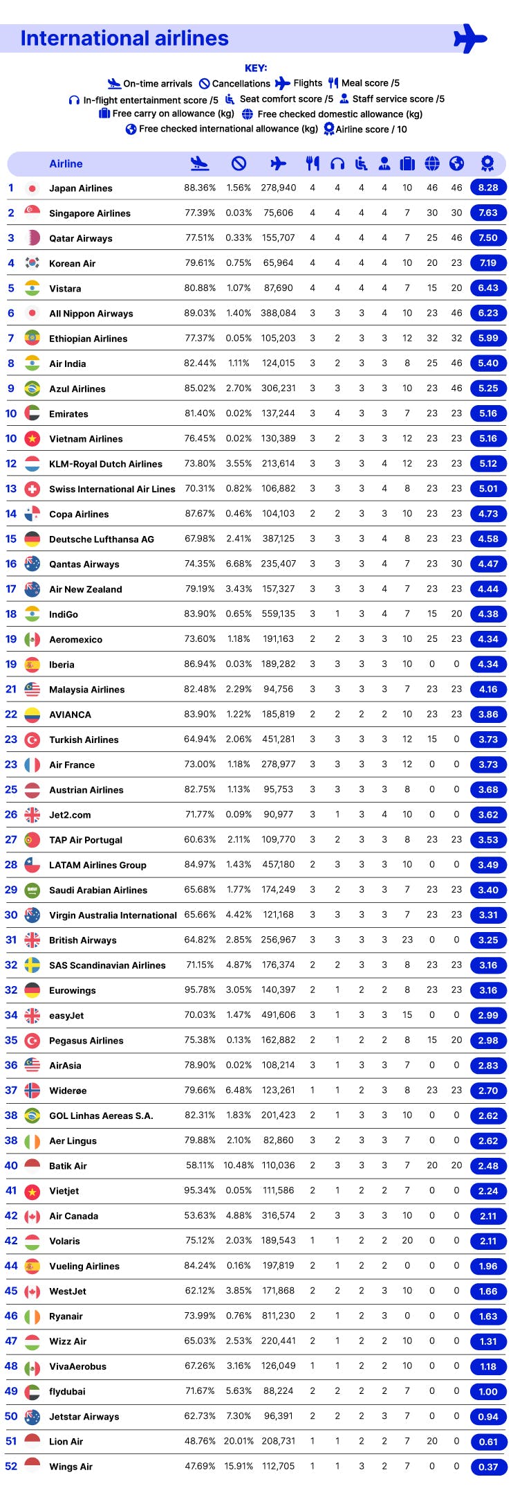 Japan Airlines is the highest-ranking international airline for 2023, with an overall score of 8.28. Japan Airlines scored a consistent 4 out of 5 across in-flight entertainment, meals, seat comfort, and staff service while also having one of the best records for on-time arrivals at 88.36%.