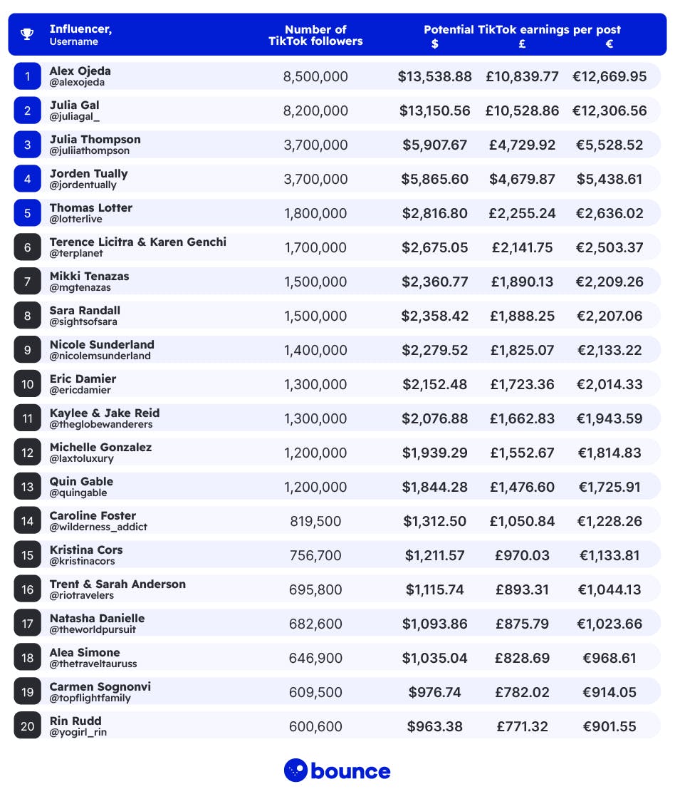 - Potential TikTok earnings per post - $5,865 | £4,679 | €5,438