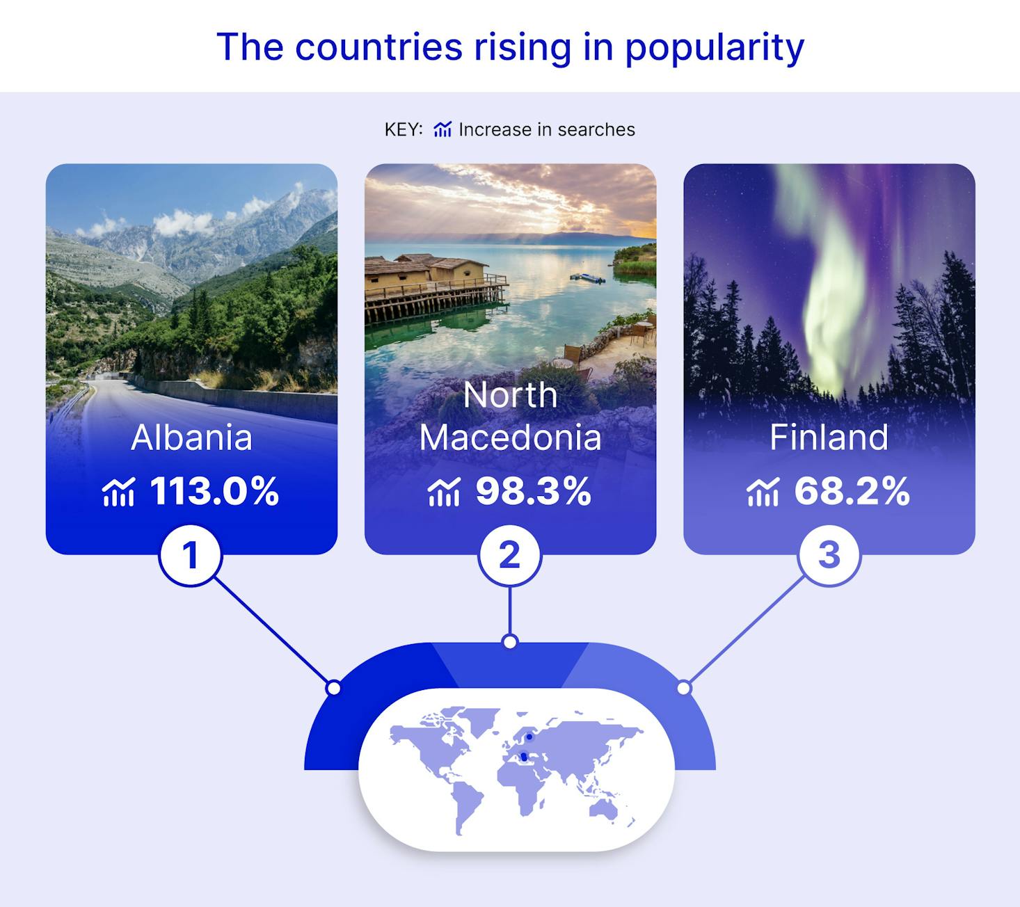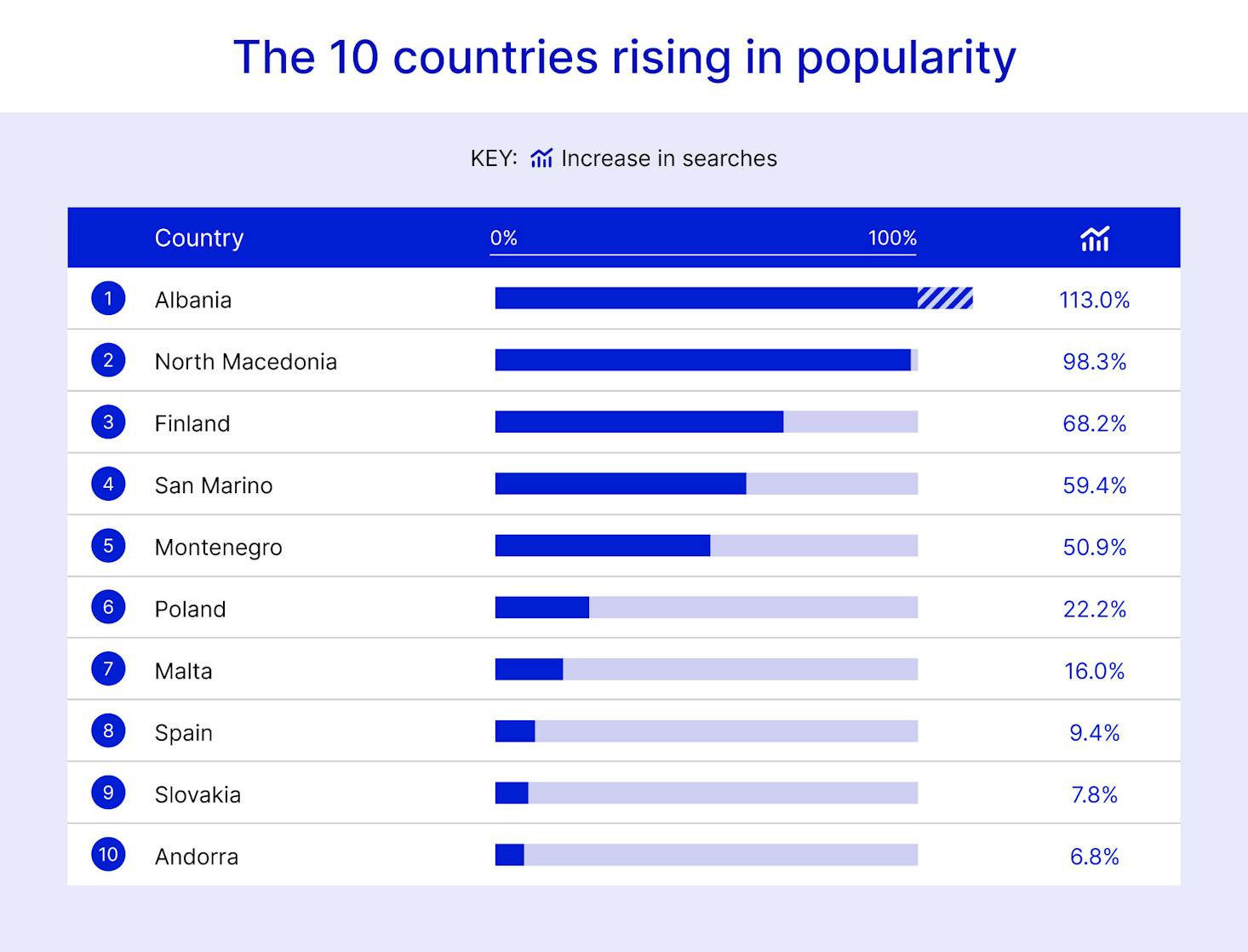 In third place, Finland has seen a 68.2% increase in searches over the last year. The Nordic nation is the perfect location if you’re planning a cozy winter city break in its capital, Helsinki, or taking in the country’s beautiful natural landscape of hilly forests and crystal-clear lakes.