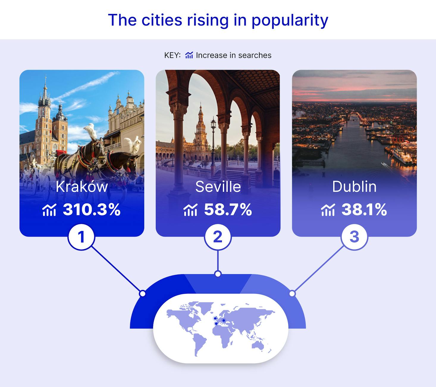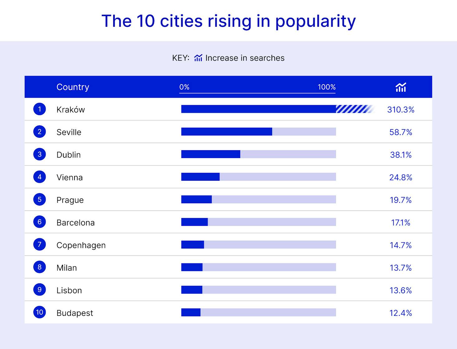 By far the most popular city by search increases, Kraków takes the top spot with 310.3%. As well as being affordable, the Polish city’s Old Town is a UNESCO World Heritage Site, making it a haven for those looking to experience its unique architecture and rich history.