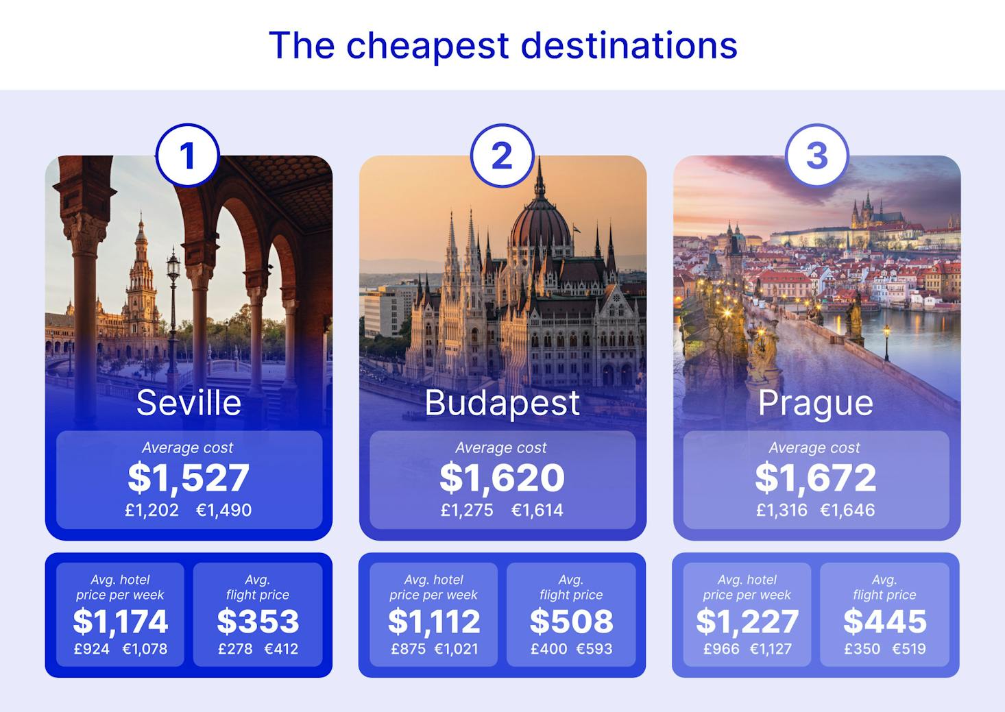 In first place is Seville, with a week’s stay averaging $1,527 for two people, including flights. The Andalusian city is perfect if you’re vacationing on a budget, with free walking tours of the city and cheap attractions like the Museo de Bellas Artes.
