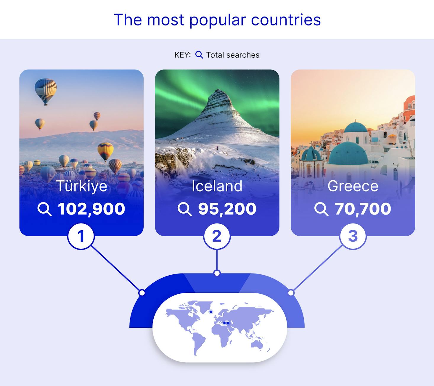 Thanks to the rich history and culture of cities like the capital, Istanbul, and the year-round sunny weather and warm beaches of Antalya, Türkiye can be crowned the most popular vacation destination for Brits in 2024, with the country receiving more than 100,000 total searches over the last three months of 2023.