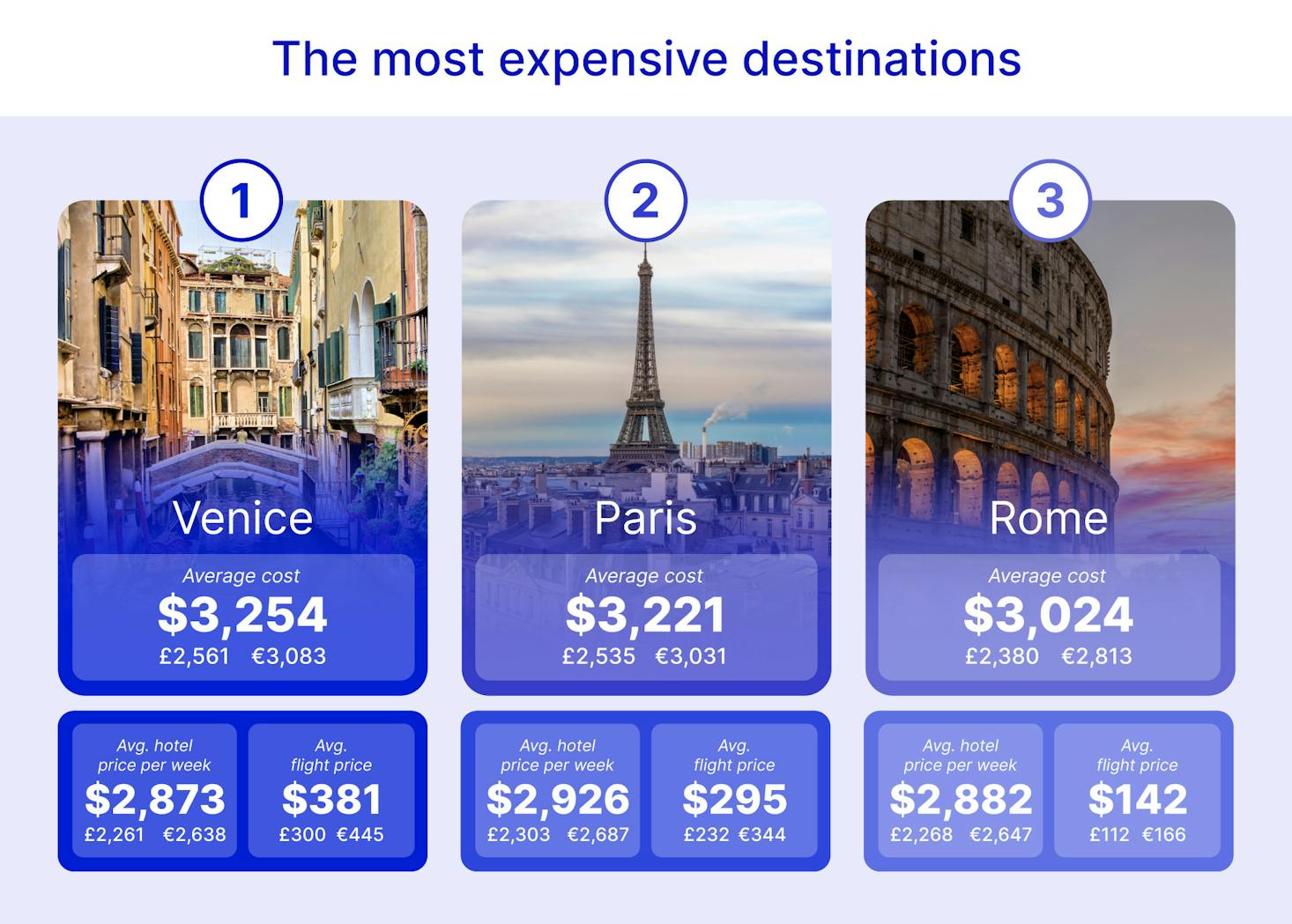 Venice, with its picturesque canals and bridges, is home to some of Italy’s greatest landmarks. It is the perfect sightseeing destination, from the Doge’s Palace to Saint Mark's Basilica and the Rialto Bridge. It’s also the most expensive city to visit, with a week’s vacation in Venice setting you back $3,254 on average.
