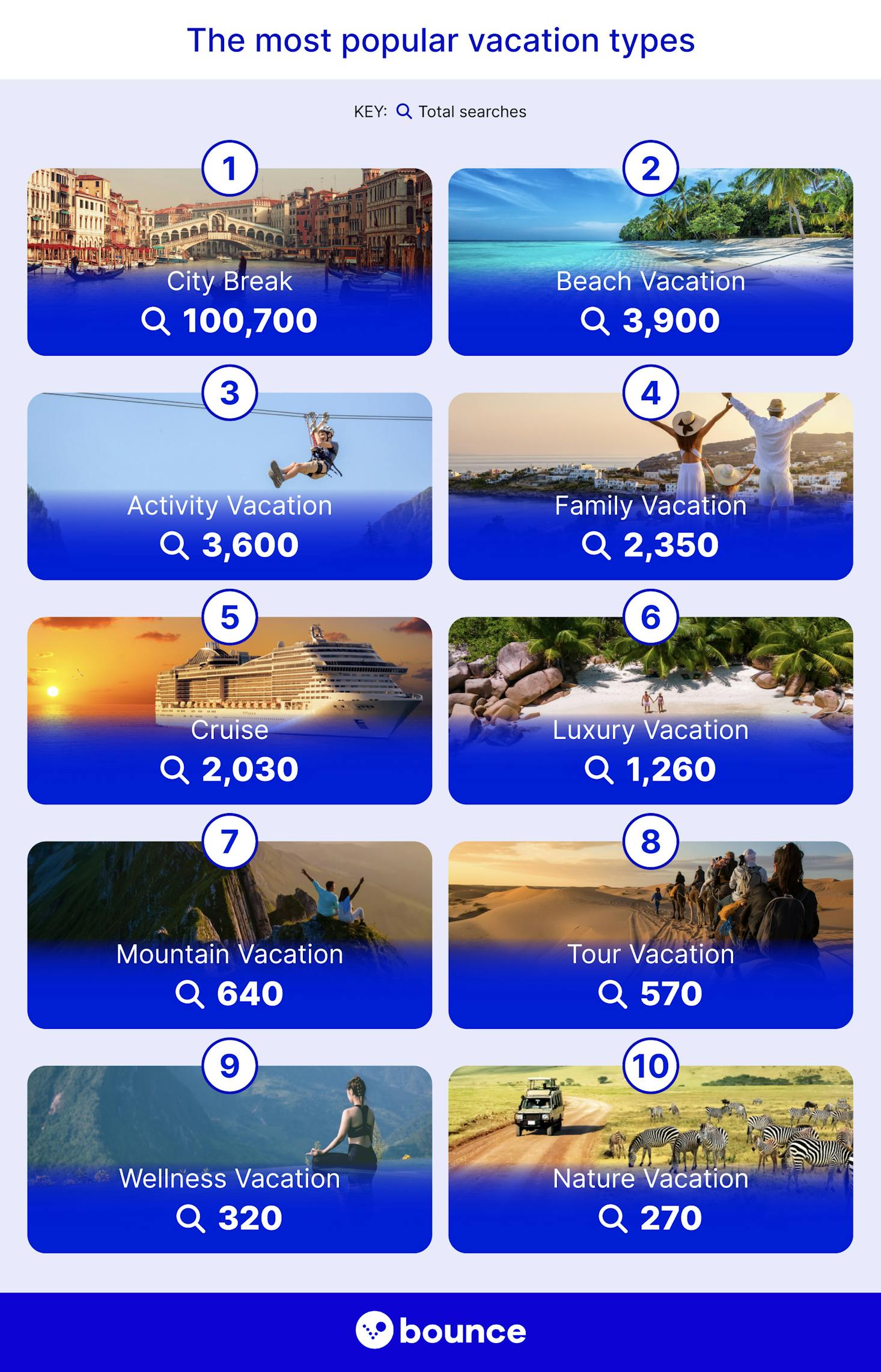 To find the most popular vacation types, we gathered a list from sites such as Mailtravel and took the total number of searches from October to December 2023 using Google Ads Keyword Planner.