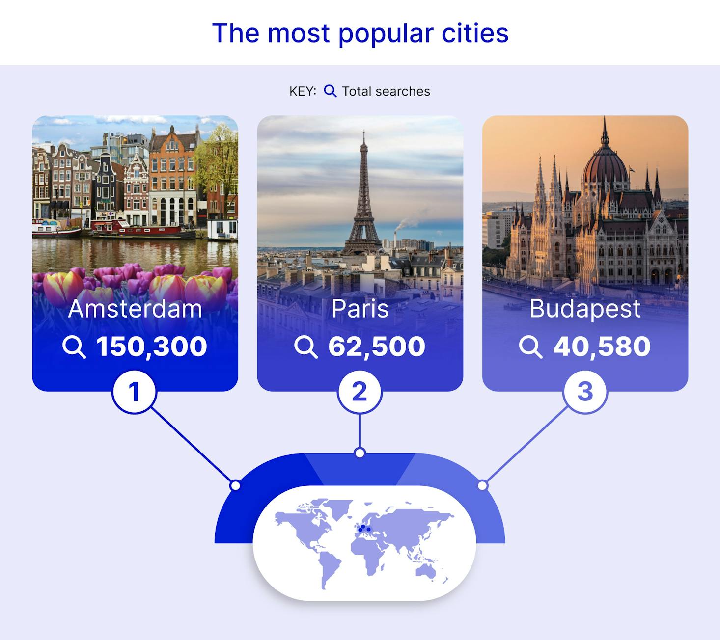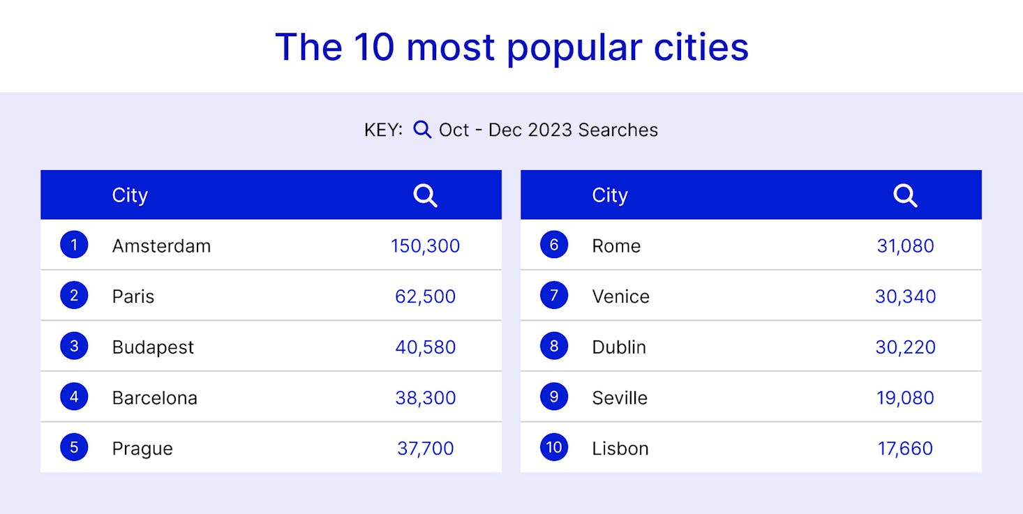 The Dutch capital, Amsterdam, is the most popular city destination for Brits in 2024, resulting from a total of 150,300 searches between October and December 2023. The city boasts plenty of things to do, from visiting the Van Gogh Museum to taking in the picturesque canals and quirky architecture.
