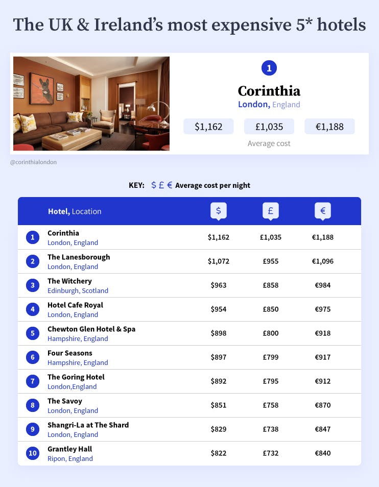 Corinthia ranks as the UK’s most expensive five-star hotel. On average, it costs £1,035.00 ($1,162.05 | €1,187.76) to experience this hotel’s perfect blend of grandeur and elegance.