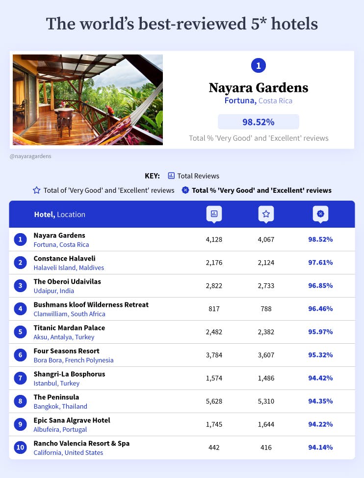 The award-winning Nayara Gardens located on the outskirts of the Arenal Volcano takes the number spot after receiving 98.52% outstanding feedback from fellow pleasure seekers. Guests can immerse themselves in an oasis of tranquility and ultimately succumb to the magic of the rainforest, marveling at its plush tropical gardens.