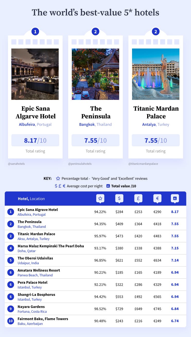 The total rating for the best value five-star hotels was calculated using a combination of both ‘good’ and ‘excellent’ reviews, as well as the average cost of a one-night stay to determine an overall score out of ten.