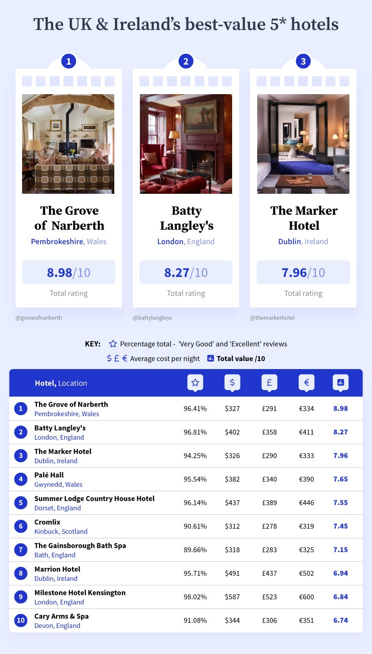 The Grove of Narberth tops the list as the UK’s best-value five-star hotel. Nestled in the heart of Pembrokeshire, this thoughtfully designed Welsh establishment costs an average of just £291.45 ($327.23 | €334.47) for a one-night stay.