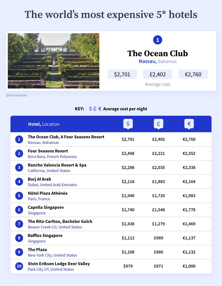 Though it may not be on our best-value list - known as the legendary Caribbean hideaway - this spectacular resort takes the crown for the most expensive five-star hotel. Costing a whopping $2,701.14 (£2,402 | €2,759.77) for just one night, guests are immersed in a true Caribbean experience, surrounded by Bahamian beauty.