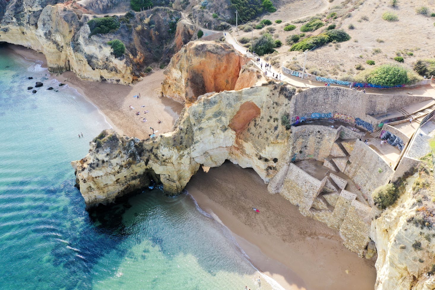 Fourth on our list of what to do in Lagos, Portugal as well as best beaches in Lagos, Portugal is Praia do Camilo. Praia do Camilo is a little further down the beach from Praia Dona Ana. What makes Praia do Camilo different? There are paths on the tops of the rock formations that lead you to incredible viewpoints surrounding the beach, multiple caves that you can wander in and out of, and a nice modern restaurant at the top where you can grab some food and/or drinks when you maybe need a bit of a break from the sun.