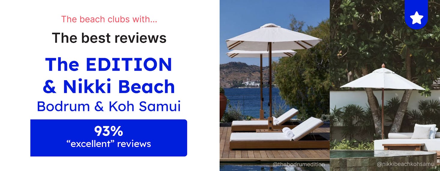 Before you jet off to soak up the sun at a beach club, you’ll want to know what to expect, from prices to amenities, and the best way to do this is by looking through customer reviews. Two beach clubs share the top spot for their proportion of “excellent” reviews, with The EDITION, Bodrum, and Nikki Beach, Koh Samui, both at 93%.