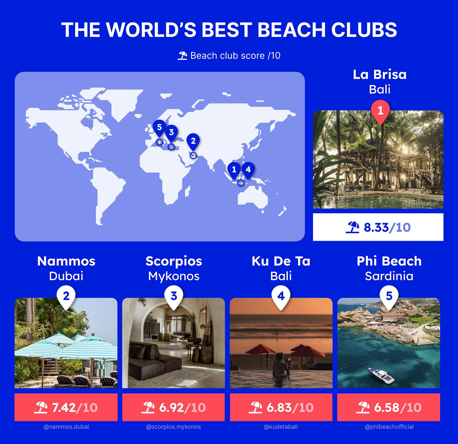 “Asian destinations rank particularly well in our index. Two beach clubs in Bali alone make the top five, with La Brisa taking the top spot. Dubai’s branch of Nommos also ranks highly. Mediterranean beach clubs are again some of the most popular, with destinations in Mykonos and Sardinia ranking third and fifth, respectively.”