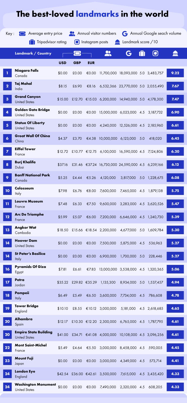 Analyzing the world’s landmarks on a variety of factors including annual visitor numbers, entry prices, Tripadvisor ratings, and Instagram posts, this report reveals the world’s most loved landmarks, as well as the landmarks that are raking in the biggest revenue from ticket sales.
