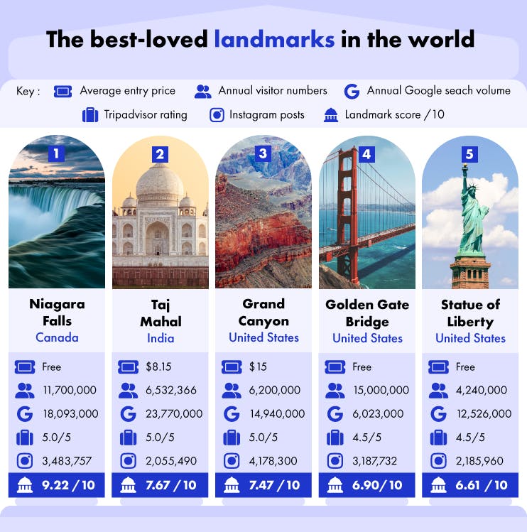 The best-loved landmark in the world is Niagara Falls, which earns a cool 9.22/10 landmark score. Free to visit, Niagara Falls sees just under 12 million visitors a year and it has a perfect 5/5 rating on Tripadvisor. This picturesque landmark also has over 3 million Instagram posts.