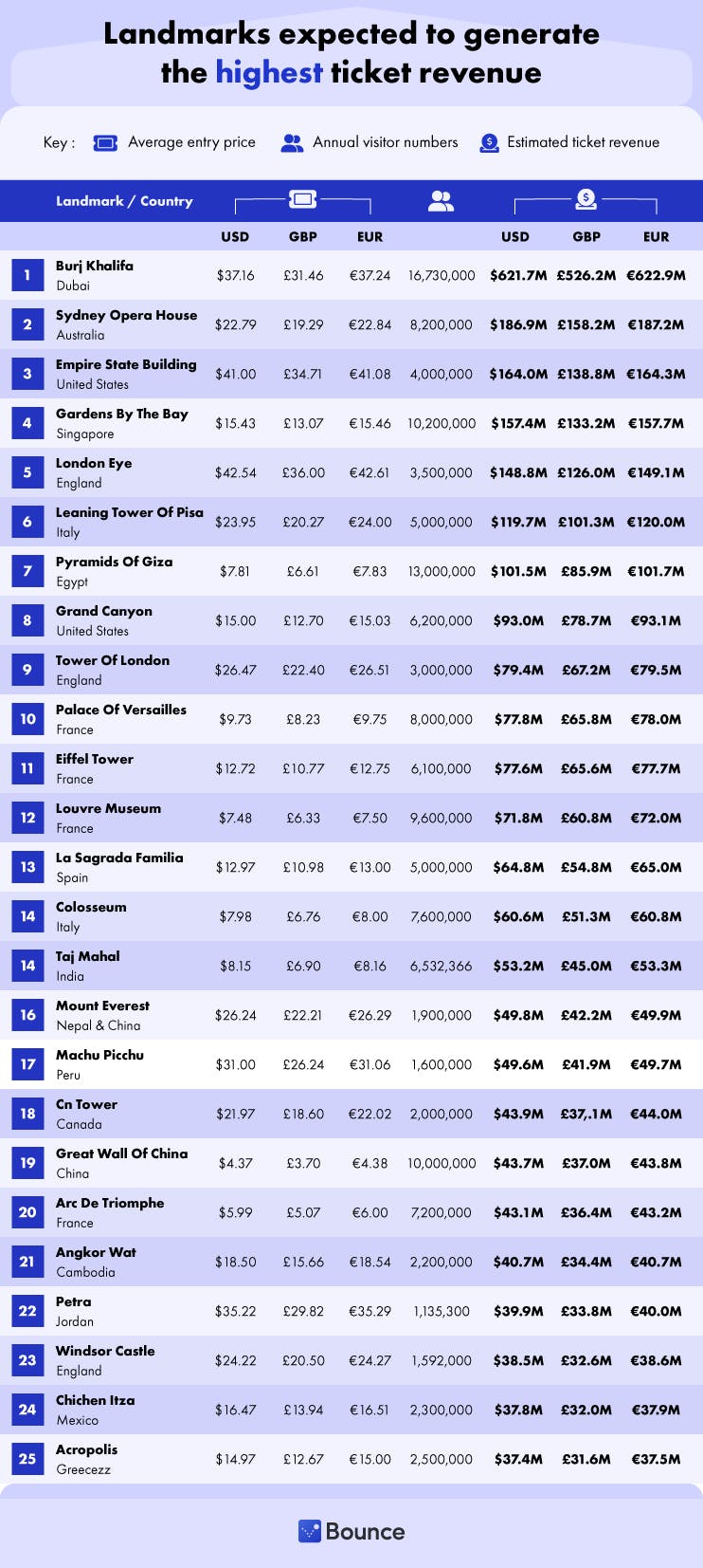 Ticket revenue is estimated as annual revenue generated by the landmark-based solely on the visitor numbers and average ticket price. The average ticket price was taken as the average between a single Adult and Child standard ticket. Many landmarks will have additional revenue streams, so please note that the ticket revenue is a ballpark figure of the revenue generated from ticket sales alone.