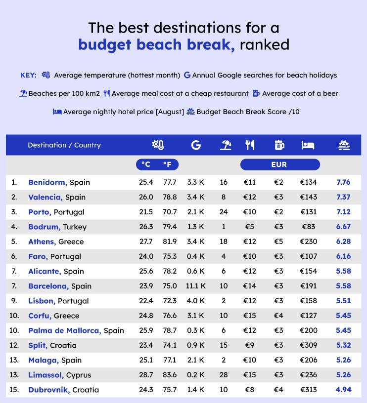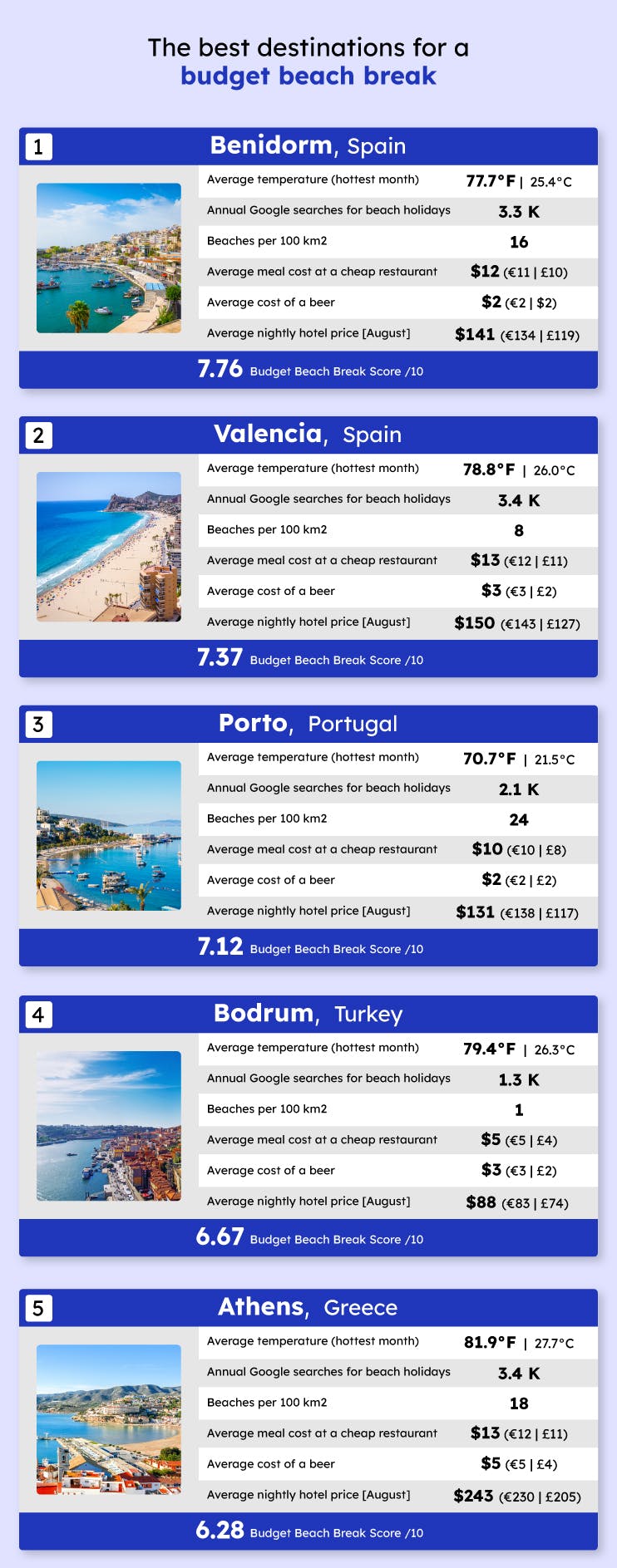 The cities on our list offer all the ingredients for the ultimate beach getaway. While Benidorm and Valencia are home to cheap beer, Porto has a great selection of beaches and Athens boasts warm summer weather.