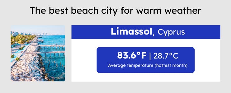 The best beach city for warm weather | Limassol, Cyprus: 83.6°F (28.7°C)
