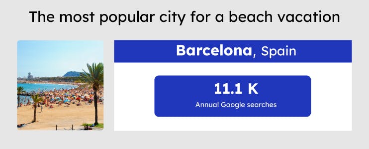 The most popular city for a beach vacation | Barcelona, Spain: 11.1 K annual Google searches