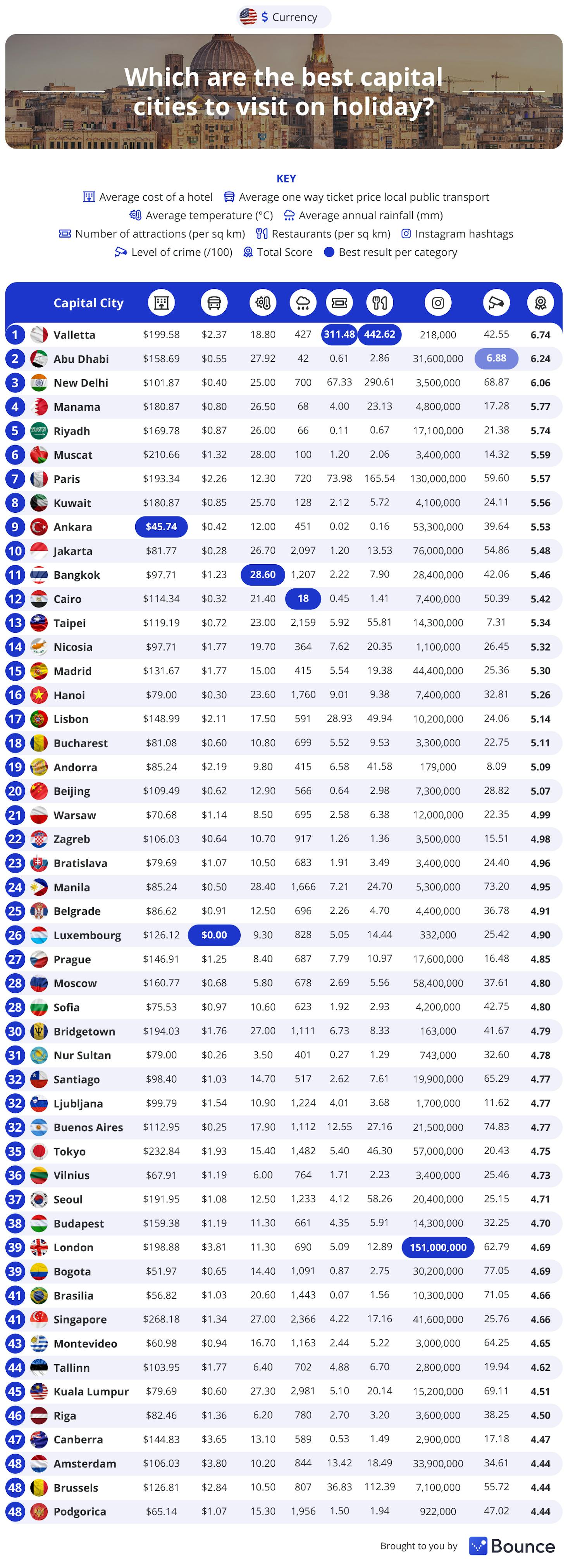The best capital city to visit for a holiday is Valletta. The capital city of the small Mediterranean island nation of Malta achieved a total score of 6.74/10. The major reason for this is the number of attractions and restaurants per square km. In fact, there are over 311 attractions per square km which is 237.5 more than the second-highest scoring capital. As Valetta is a tiny city (just 0.61 km2), there is a higher attraction density than the actual number of attractions, in total, there are 190 per square kilometer.