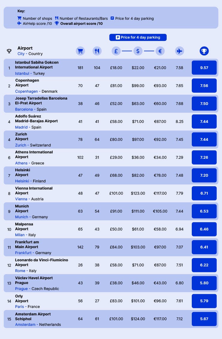 Despite remaining the best airport in Europe for pre-flight experience, Istanbul Airport’s service quality score has actually decreased from 8.30 out of 10 in 2022 to 7.58 out of 10 in 2023. However, Istanbul remains the cheapest airport in Europe, with four-day parking costing around 600 Turkish Lira ($22 / £18 / €21).