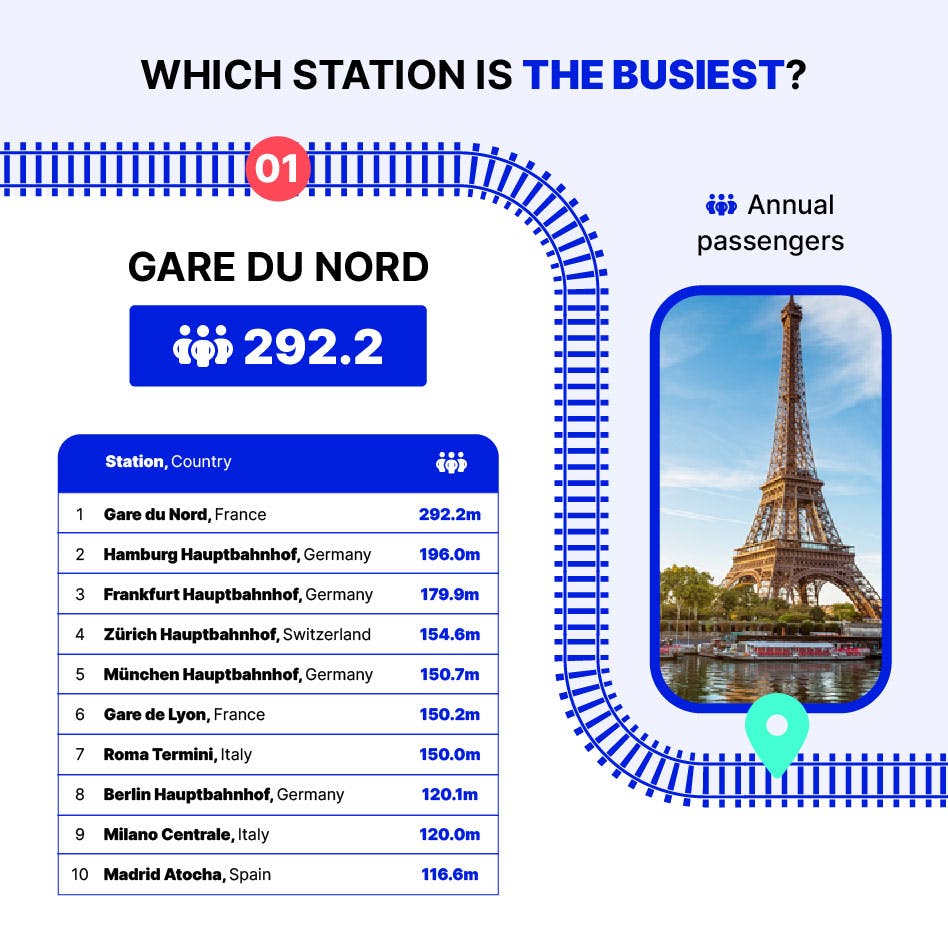Gare du Nord in Paris, France, is the busiest train station in Europe. It is a hub for domestic and international train services, including connections to London via the Eurostar service. It handles just under 300 million passengers a year, making it the busiest station on the continent.