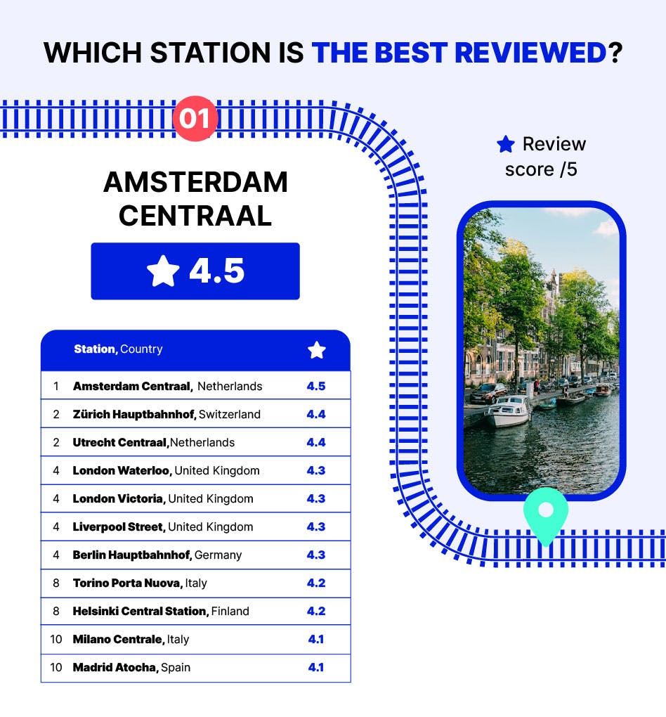 The station with the highest average review score on Google is Amsterdam Centraal, with 4.5 out of 5. The station's strategic location in the heart of Amsterdam makes it a bustling hub of activity for commuters and tourists alike. Its architecture is a remarkable blend of different styles, with its grand façade featuring a mix of Gothic, Renaissance, and modern elements.