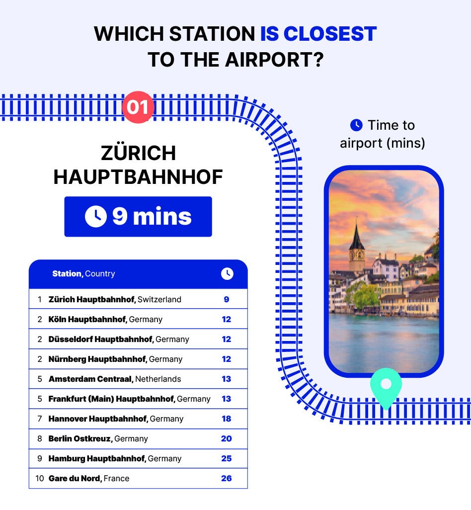 Zürich Hauptbahnhof tops the list with an overall score of 7.76, with a high review score, substantial Instagram and TikTok presence, and a remarkably short travel time to Zurich Airport.