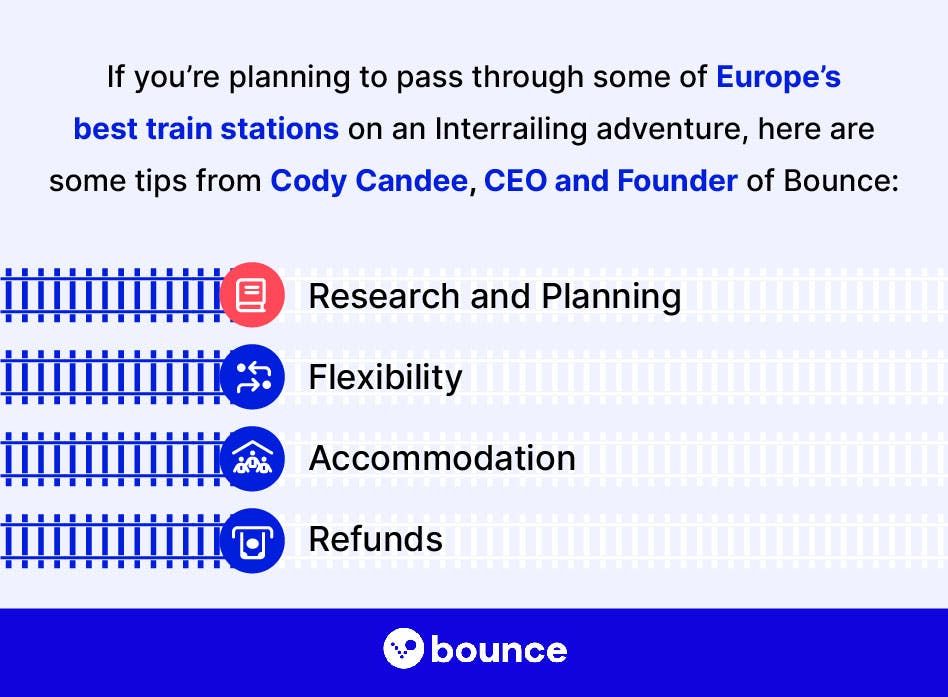 If you’re planning to pass through some of Europe’s best train stations on an Interrailing adventure, here are some tips from Cody Candee, CEO and Founder of Bounce: