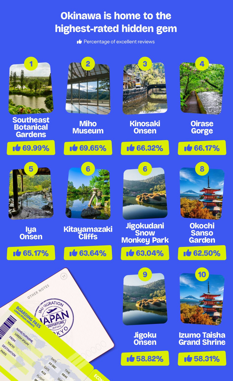 Okinawa’s Southeast Botanical Gardens is Japan's highest-rated hidden gem attraction, as 69.99% of its 863 reviews on Tripadvisor are “excellent,” the highest rating available.