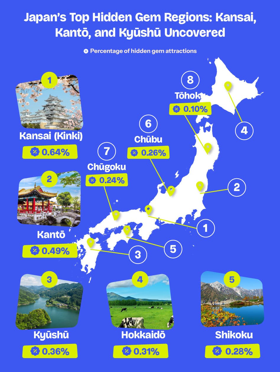 In second place is the Kantō region. Of its 29,112 attractions on Tripadvisor, 0.49% are considered hidden gems.