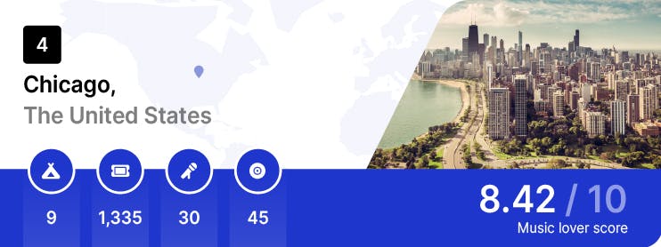 For 2023 so far, Chicago has 1,335 upcoming music events and 9 music festivals, dotted around Chicago’s 30 music venues. Chicago is set to host some must-attend festivals this year, including the internationally premier Lollapalooza, the electronic-focused North Coast Music Festival, and the indie rock-centered Pitchfork Music Festival.