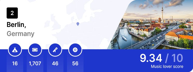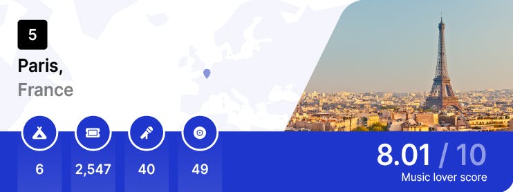 Completing the top five is Paris. The city has an outstanding 2,547 upcoming music events alongside 6 festivals for 2023. Paris is also home to 49 record stores. The city of love houses a diverse range of 40 music venues, so you can be sure to find the right live music to suit you. Paris will see performances from Bruce Springsteen, Macklemore, and Elton John this year, alongside playing host to festivals such as We Love Green and Rock en Seine.