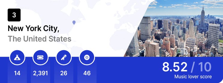 New York City ranks as the third greatest city for music lovers in 2023. There are a whopping 2,391 upcoming music events this year alongside 14 music festivals. While host to two of the biggest names in pop this year, with Taylor Swift and Ed Sheeran performing at the MetLife Stadium, New York City is the home of true rock 'n' roll.