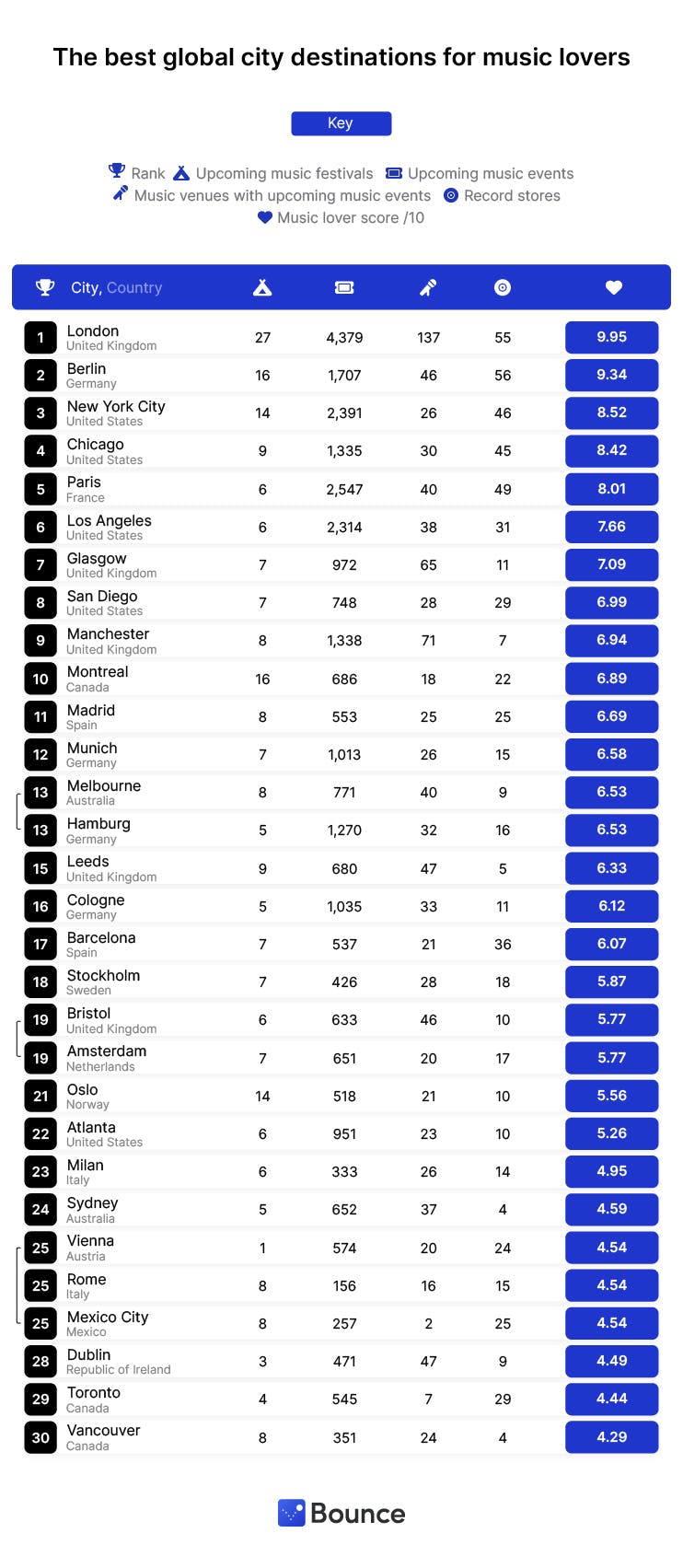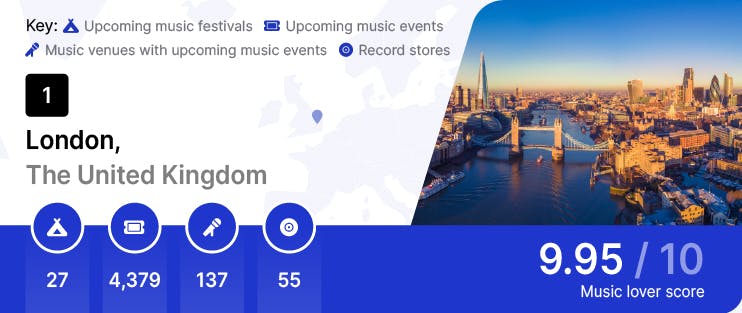 Data from all 4 factors were combined to give a normalized rank for each city, and an overall ‘music lover score’ out of 10, to reveal the best city breaks for music lovers in 2023.