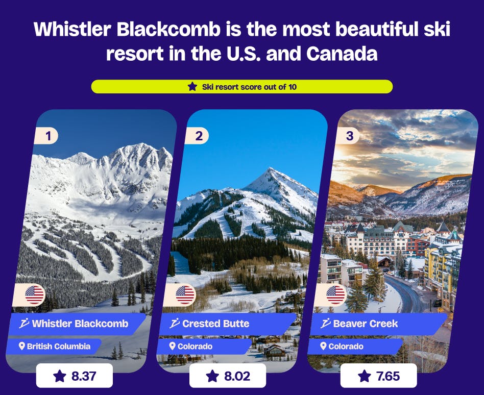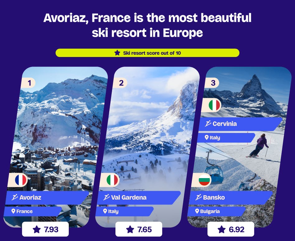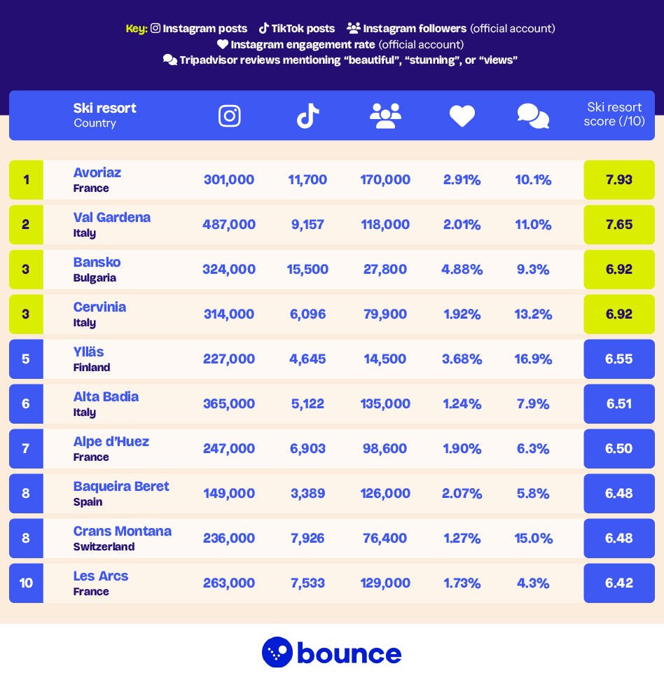 The team at Bounce has found ski spots that combine world-class slopes with stunning views by collecting data on the number of social media posts, the engagement rate of official resort accounts, and visitor reviews.