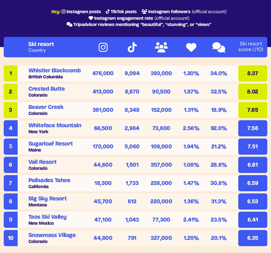 Using the official Instagram accounts for each ski location, we found the number of followers and the engagement rate using Inzpire’s Instagram calculator.