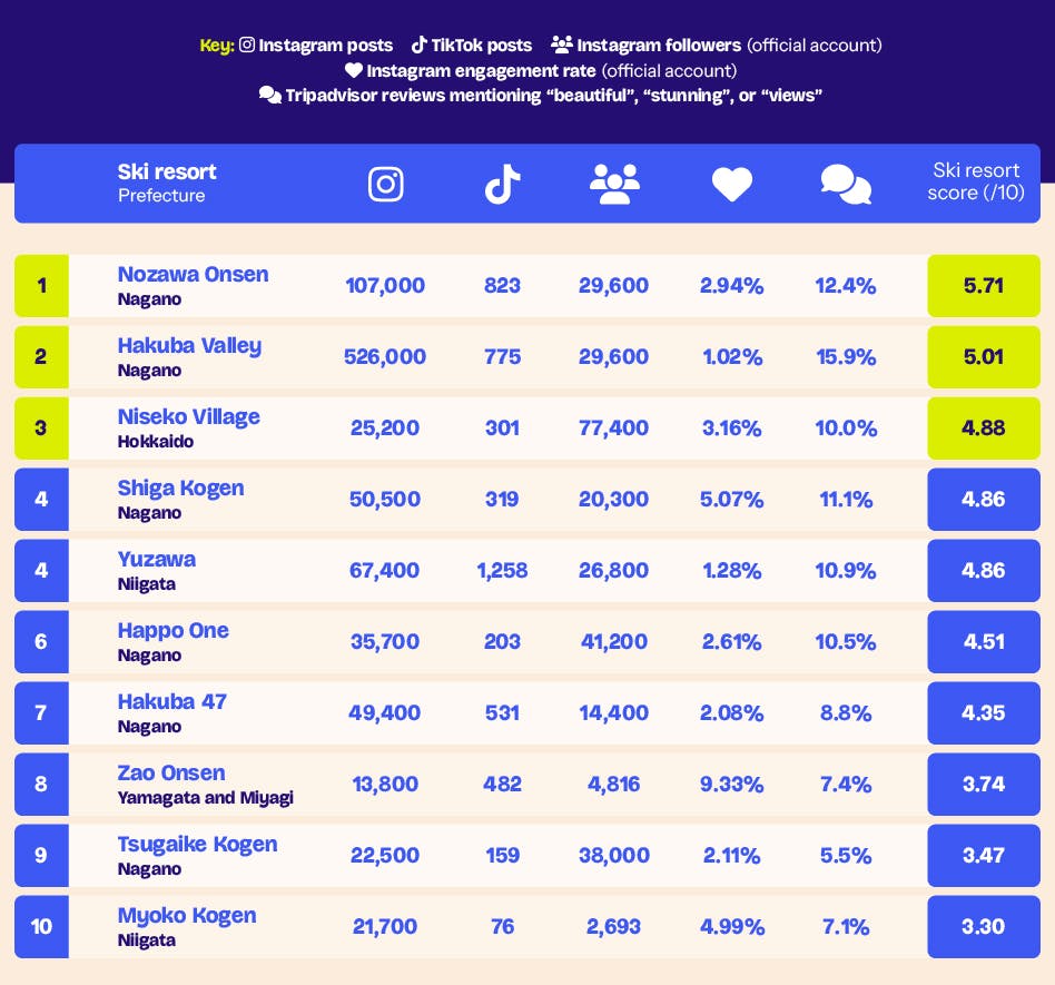 Niseko Village is the crown jewel of Hokkaido, known for its world-class powder snow and luxurious vibe. While it has a smaller social media footprint — just over 25.5K posts on both Instagram and TikTok — its quality still shines through. The official Instagram account has 77.4K followers and an engagement rate of 3.16%, which shows the high amount of interaction posts receive.