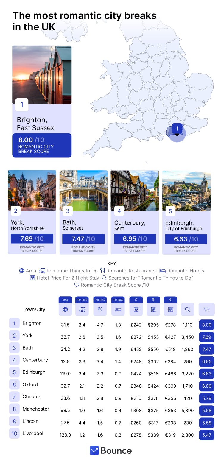 Brighton scored highly for its romantic restaurants with a total of 149 establishments (4.7 per km2), and also its affordability ($295|£242|€278 for a two-night stay).