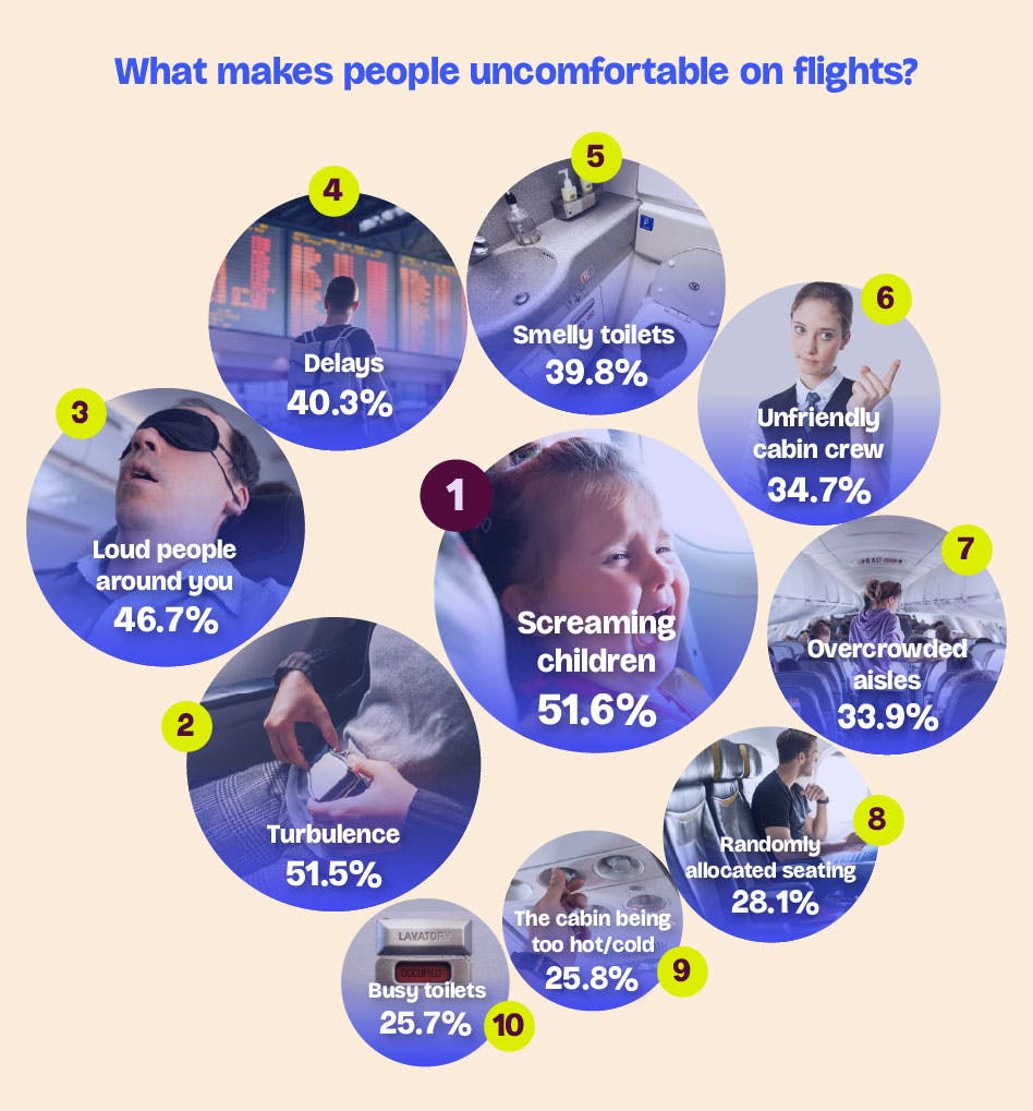 According to our survey, over half of travellers (51.6% and 51.5%, respectively) say screaming children and turbulence make their flying experience uncomfortable. This is over double the number of people who find busy airplane toilets unsettling.
