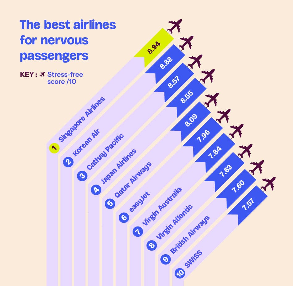 Whether you're heading to sunny Santorini or a weekend getaway in Palm Springs, we’ve found the best airlines for nervous flyers.