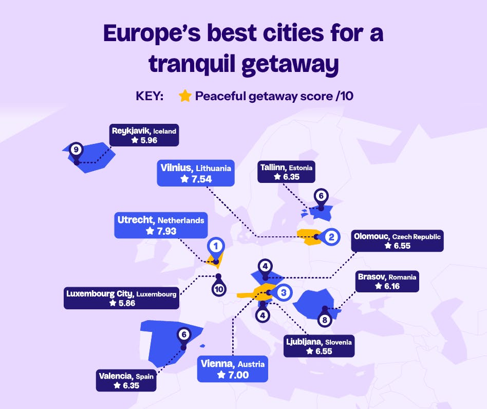 The best place for a peaceful getaway in Europe is Utrecht, with a score of 7.93 out of 10. Utrecht is a small and charming city in the Netherlands, known for its picturesque canals, historical buildings, and inviting atmosphere. Utrecht is also an excellent place for foodies, with a beloved cafe culture and exciting bar scene - some people even consider this the highlight of their trip.