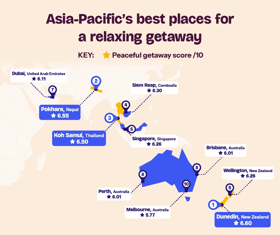 “When choosing your destination, one of the most important considerations is noise pollution. A report from the World Health Organisation (WHO) suggested that noise pollution was a significant cause of ill health in Western Europe.2 Reykjavik and Dunedin were Europe and APAC’s least polluted cities by noise and light, making these cities a great option for a calmcation.