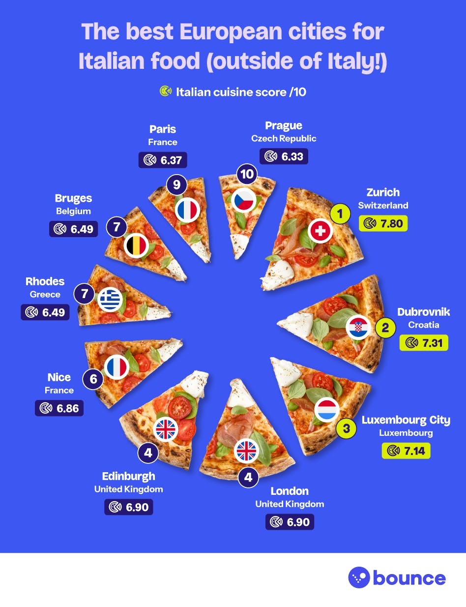 These factors were combined into a single score to reveal the best European cities outside of Italy for Italian cuisine.