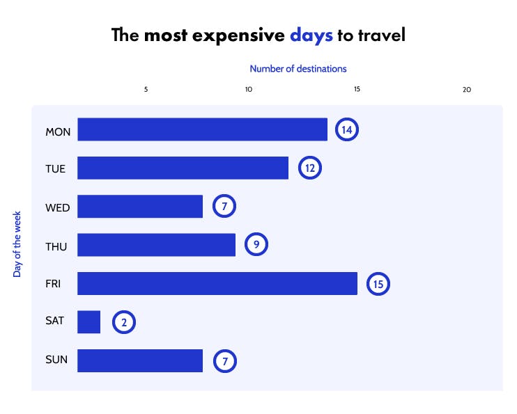 In some destinations, we found that Monday is the cheapest day to travel. In Osaka, a hotel stay on Monday could cost 359% less than the same stay on a Friday.